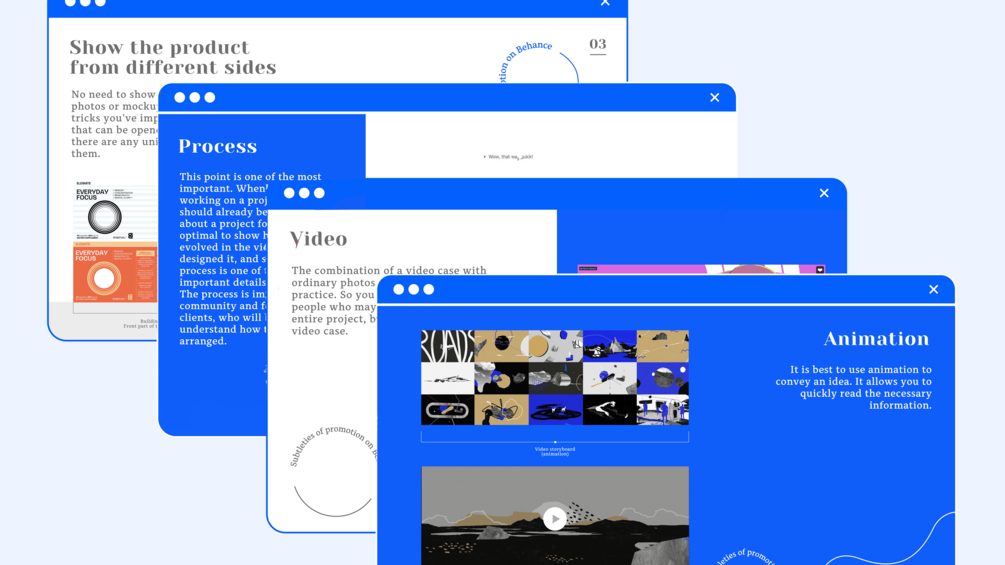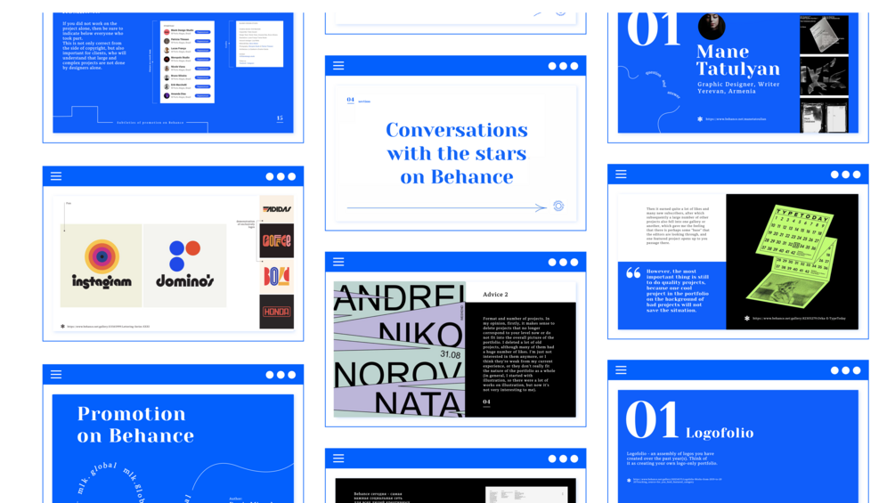 The biggest promotion guide on Behance. 185 slides with unique content that will help any designer improve their Behance and receive applications from this service. Inside you will find: How to structure a project on Behance.